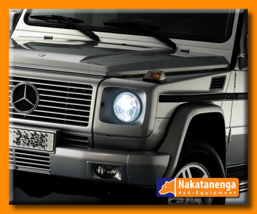 NOLDEN 7" Bi-LED main headlight kit with two headlamps with low-/high-beam and adaptor for Mercedes G. Available in different colours. Innovative 7" LED main headlight with proven reflector technology combines low- and hight-beam as well as position light in one lamp. Original dimensions and standard H4 socket mean that this is an easy to fit, durable replacement upgrade for any Mercedes G Wagon. Also fits (in some cases with additional apaptors or wiring looms) other vehicles, like Land Rover Defender, various Toyota, Jeep Wrangler JK/TJ/CJ, etc. The integrated electronic driver / control unit makes for easy fitment. NOLDEN headlights are road legal, of course. They have ECE (also known as E-marked) and SAE approval and are available for either LHD (EU version) or RHD (UK version) vehicles. You can choose between light-crome and darker dark-crome looks. Compared to traditional halogen headlights LED lights offer many advantages: higher light output ("more light") more comfortable light ("white light"), closer to sunlight low energy consumption (32/39 W compared to 55/60 W low/high-beam) vibration and shock proof design (especially important for diesel cars or off-road use) never again (ca. 30.000 hrs lifetime) white road Illumination compatible with HID/Xenon one of the brightest LED high and low beam 7“ headlights available Many users of classical vehicles, especially off-road vehicles (Defender, Wrangler, G-Wagon) have been looking for modern headlights with classical looks. Up to now 7“ LED headlights had offered better illumination than halogen headlights, yet they didn't give optimum illumination or were of inferior design. In addition these were often retrofitting solutions that didn't meet OEM specifications. The new NCC 7“ Bi-LED headlight was especially tailored to meet the OEM requirements. All components, from the LED to the plug, are designed and produced accordingly making up a perfect overall system. The design of the 7“ Bi-LED headlights reminds more of a conventional halogen headlight that looks like the well-known classic design. The familiar appearance of the vehicle is thus not changed much and essentially still looks like “OE“. The illumination level of the new NCC 7“ Bi-LED headlight is equally good as that of a Xenon headlight. However, the new NOLDEN headlight system has the big advantage of a lower current consumption, which increases the life of the system significantly thus noticeably lowering the operating costs. In a normal case it can be expected that the life of the NCC 7“ Bi-LED headlight is much longer than that of the vehicle. The ligths don't require headlight adjustment or the headlight cleaning system of the Xenon system, retrofitting with the new NCC 7“ Bi-LED headlight is therefore much easier, faster and in the end less expensive than is the case with the Xenon headlights. Technical details: dimensions in mm: 177 x 152 number of LED: 5 x Osram Automotive output (low-/high-beam): 32 W / 39 W voltage range: 9-32 V lumens calculated: 1,880 lm / 2,400 lm lumens measured: 1,550 lm / 1,700 lm fixing: PAR56 homologation: ECE, SAE front lens: UV resistent polycarbonate hard coated front lens housing: lightweight, rigid alumium housing waterproof: 480 h salt spray tested and fully water proof to IP6K9K NOLDEN Bi-LED main headlights are also suitable and approved for many European, Asian and American motorbikes. The Nolden LED lights are available in chrome, dark-chrome and matt black and also for RHD vehicles. Please choose the desired version. You get one complete set for your vehicle. IMPORTANT: We do not ship the right-hand drive / left-hand traffic versions to UK.UK customers please visit www.4x4overlander.com for the RHD/LHT headlights.
